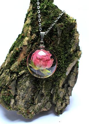 Милый кулон ручной работы с розой. Растения залиты ювелирной смолой. Изделия не хрупкое,но стоит избегать попадания воды. Диаметр кулона 25 мм. В комплекте идет цепочка любой длины или шнурок. Корейская фурнитура не содержит опасных добавок. Рекомендации по уходу за украшениями: 1. Украшения из ювелирной смолы хранить отдельно в сухом и затемнённом месте. 2. Избегать попадания ацетона, спирта, лака для волос, парфюмов и других химических веществ. 3. Не мочить(желательно) 4. Избегать резких перепадов температур(сауна,баня) 4. Если со временем потерялся глянцевый вид украшения, появились микроцарапины в процессе эксплуатации, протрите украшение мягкой тряпочкой, используя каплю полироли на основе пчелиного воска. 5. Одевать украшения стоит в последнюю очередь -духи, крем или лак для волос может навредить глянцевому покрытию. В нашем магазине можно подобрать сережки и кулоны,кольца и браслеты к любому наряду.
