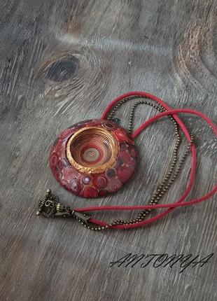 Кулон выполнен из запекаемой полимерной глины, кулон прочный и не боится воды. Кулон выполнен в шприцевой технике, подобраны красивые бордовые оттенки, отшлифован и покрыт качественным лаком. Длина шнура около 50 см, диаметр кулона около 6,5 см