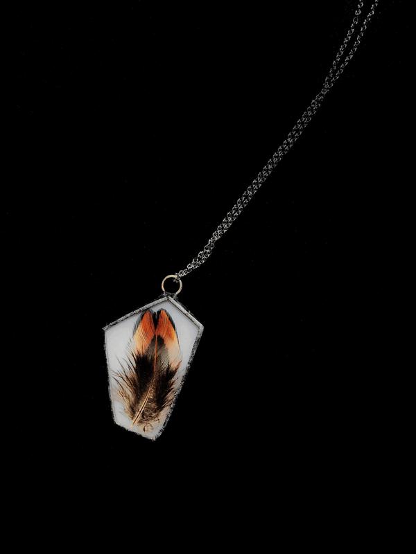 Маленький кулон на білому склі, з пером виготовлений у вітражній техніці