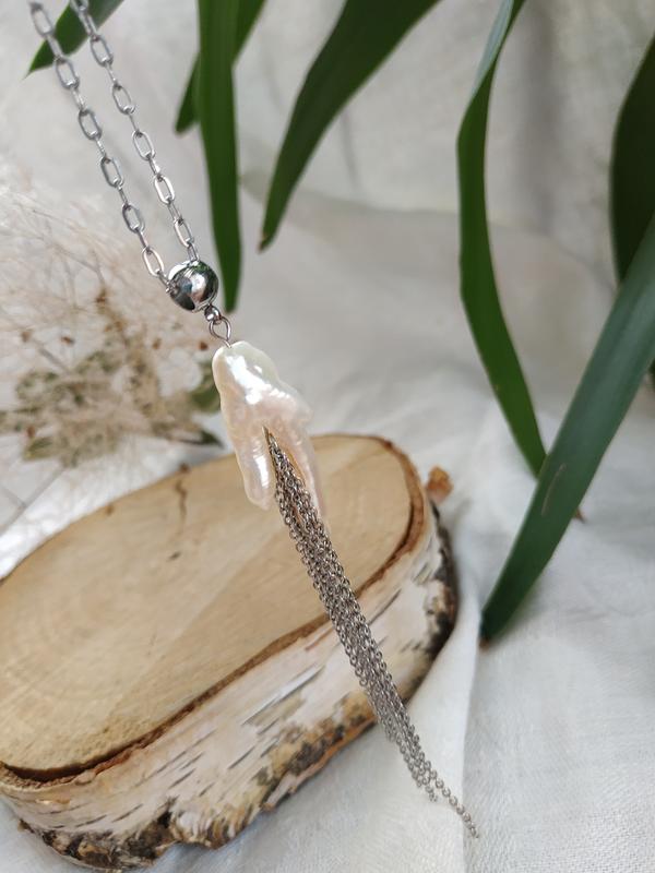 Стильний кулон на ланцюжку ручної роботи з натуральної прісноводної барокової перлиною повністю на фурнітурі з ювелірної нержавіючої сталі сріблястого кольору. Довжина кулона 11 см. Довжина кольє на шиї 41-46 див. Перли, має неправильну форму, називають бароко або бароковий. Він може бути диким чи культивованими. Імовірно, назва походить від французького слова «baroque» – химерний, чудернацький. Жемчуг барокко, как и любой другой, формируется в пресноводных или морских моллюсках. Необычная форма получается при неравномерном отложении перламутра вокруг ядрышка, попавшего в устрицу естественным путём либо помещённого в неё человеком. Если идеальный по форме жемчуг требует с себе вечерний наряд или строгий костюм, то украшения с барочным жемчугом уместны в любой обстановке