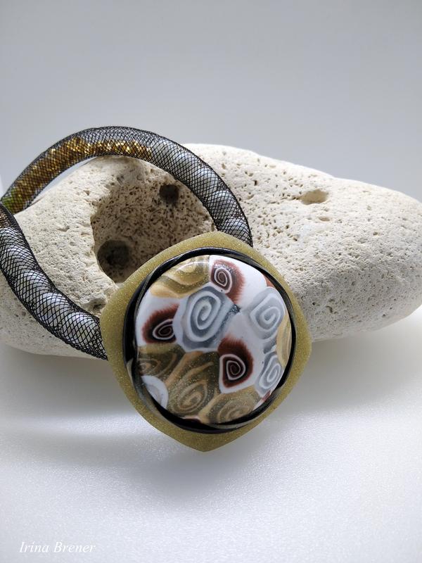 Интересный узор, модная форма кулона привлекают внимание, а бусины в бижутерной сеточке добавляют особый акцент изделию.
