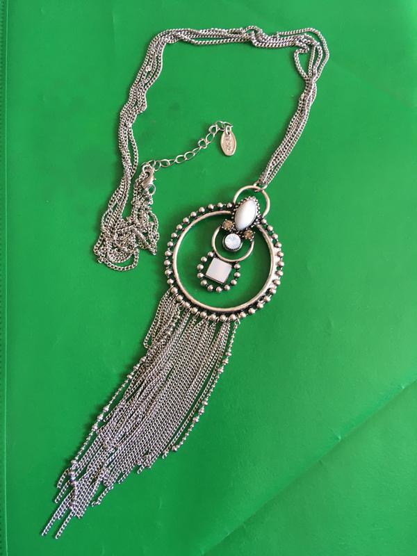 Кулон на длинной цепочке двойной очень стильно смотрится.Вставка натуральный перламутр Длина цепочки 76смКудон с подвесками цепочками 15см.диаметр 5см