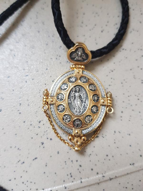 Срібна підвіска 925 проби. Унісекс. Покрита чорнотою і спеціальним засобом під золото. Зображення: "Ангел Хранитель. Голгофа. Господь Вседержитель. Толгская икона Божией Матери" Розмір 5см на 3.4см. Приблизна вага 23грама. Під замовлення. Ціна без шнура. Зі таким шнурком +550грн. Є ще варіанти шнурків.
