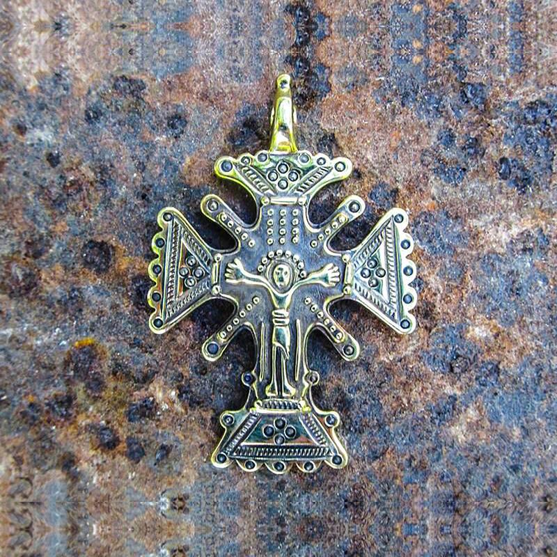 Традиційна гуцульська прикраса-оберіг. З давніх часів вважалося, що зґарди є символом єднання чотирьох земних стихій: землі і вогню, повітря і води. Також символ розкриває взаємозв'язок часу і простору, енергії та інформації. Іноді на мальтійському хресті зображується розп'яття людини, яке символізує його призначення слухати і слідувати Божій волі. Крім того багато хто вважає що мальтійський хрест ― це знак гармонії людини з усім світом. Латунь, литво. 46х31 мм.