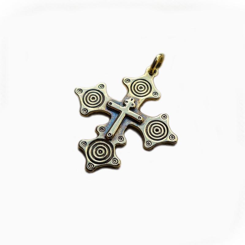 Традиційна гуцульська прикраса-оберіг. З давніх часів вважалося, що зґарди є символом єднання чотирьох земних стихій: землі і вогню, повітря і води. Також символ розкриває взаємозв'язок часу і простору, енергії та інформації. Іноді на мальтійському хресті зображується розп'яття людини, яке символізує його призначення слухати і слідувати Божій волі. Крім того багато хто вважає що мальтійський хрест ― це знак гармонії людини з усім світом. Латунь, лиття. 31x28 мм.