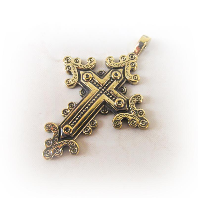 Традиційна гуцульська прикраса-оберіг. З давніх часів вважалося, що зґарди є символом єднання чотирьох земних стихій: землі і вогню, повітря і води. Також символ розкриває взаємозв'язок часу і простору, енергії та інформації. Іноді на мальтійському хресті зображується розп'яття людини, яке символізує його призначення слухати і слідувати Божій волі. Крім того багато хто вважає що мальтійський хрест ― це знак гармонії людини з усім світом. Латунь, лиття. 47x32 мм., вага близько 7 г