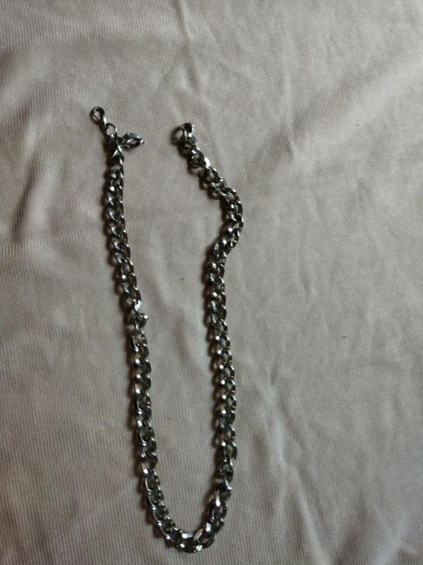 цепка металлическая, длина 45 см, застежка карабин, есть неблагоприятное: выдерлось одно сено, можно поправить.жененька.можно носить как украшение на шею ажно и на штанах или жакете, как нравится:)