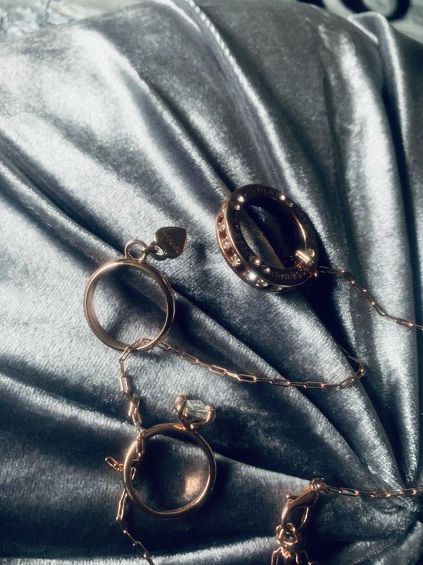 В рожевому кольорі 💍 з каменем 15 розмір, цепочка з кулоном 16 розмір, 17 розмір ,всі мед сплав ☝️👍