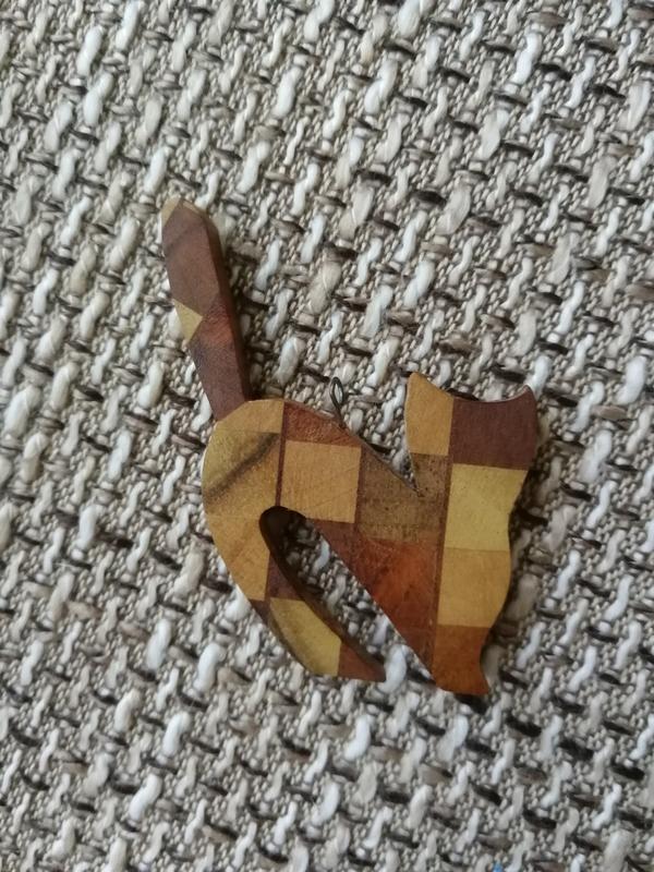 Підвіска з різних порід дерева у вигляді котика. Є маленький крючечок, можна носити на шнурку або ланцюжку