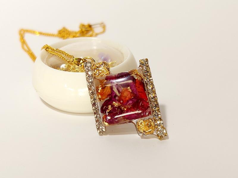 Подвеска ручной работы из ювелирной смолы и живых цветов (роза),цепочка позолота 45 см.