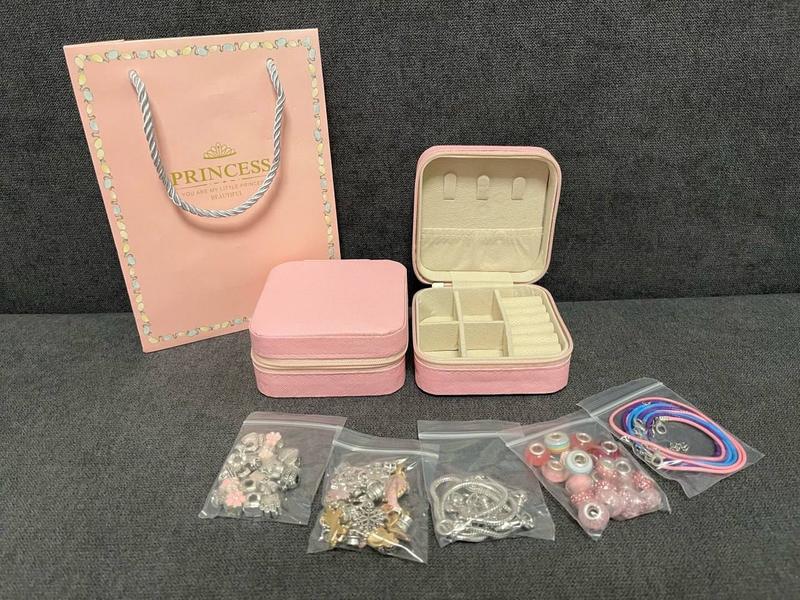 подарочный набор В набор входит: 3 цепочки на руку (всей длинна 19 см, можно регулировать) 3 шнурочки на шею (всей длина 41 см, фиолетовый, голубой, розовый) 60 различных шармиков , ящик для хранения украшений подарункова упаковка Princess Приобретайте лучшие подарки на праздники ❤️ 💸Цена: 700грн •50 шт фото 2-4 реал 🤍🤍🤍