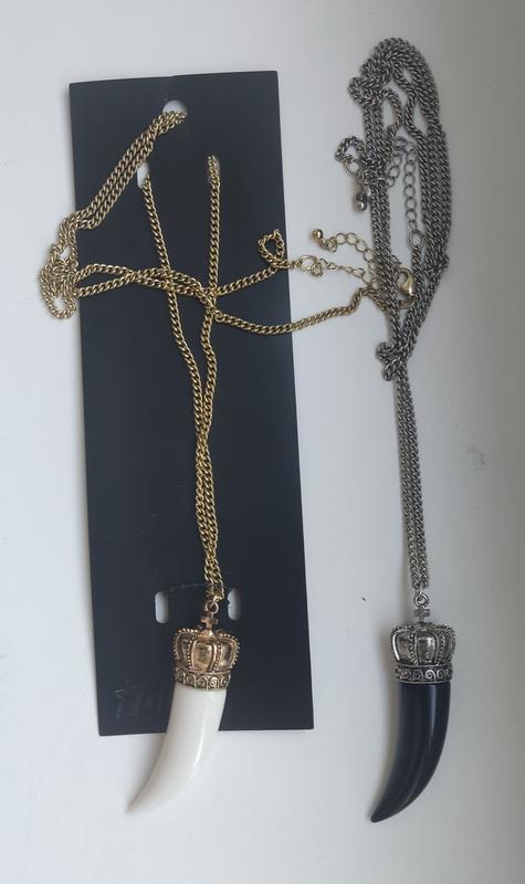 Подвес H&M Рог в черном и белом цвете, длина цепочки 45 см, застёжка на карабин. Общая длина подвеса 53 см, длина кулона 6 см. Цвет цепочки на черном кулоне белый, на белом кулоне золотой.