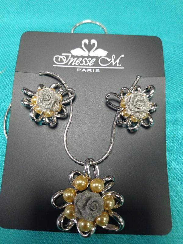подвеска длинная..с ажурными выпуклыми цветками..украшена жемчужинами..серьги в комплекте.