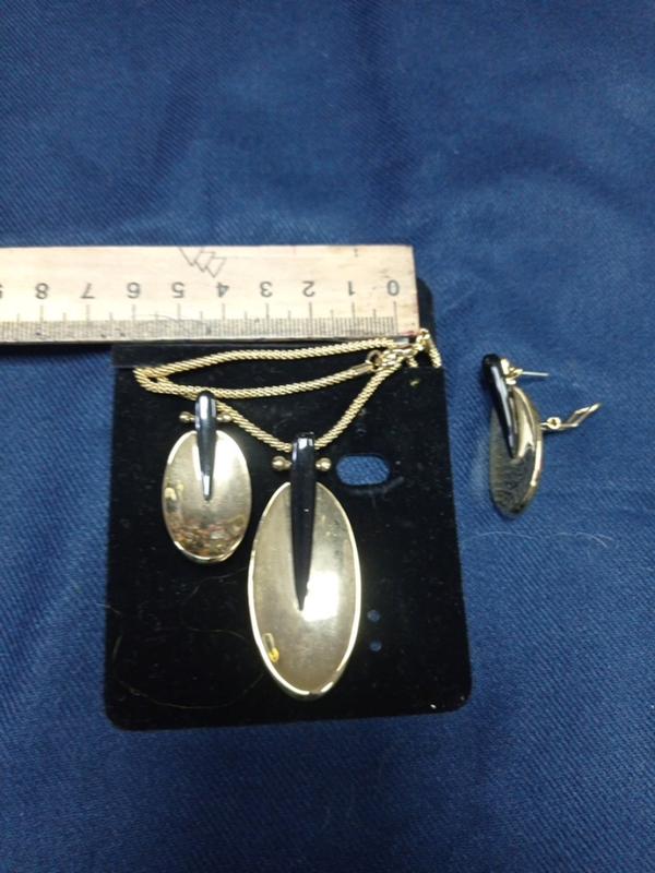 подвеска золотистая..выгнутая..с черными вставками..на длинной золотистой цепочке..серьги в комплекте.