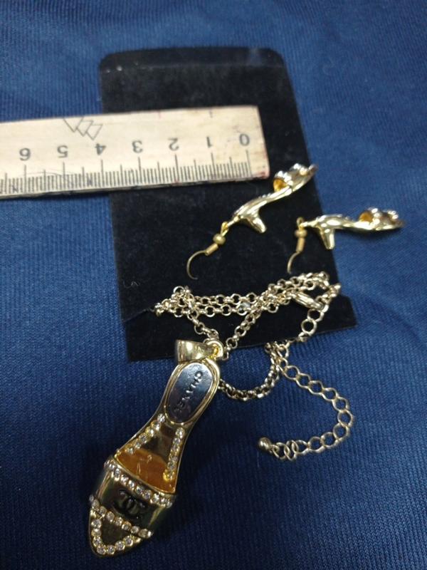 подвеска туфелька..золотистая.с камушками..надписью..интересова.длинная регулируемая цепочка.серьги в комплекте.