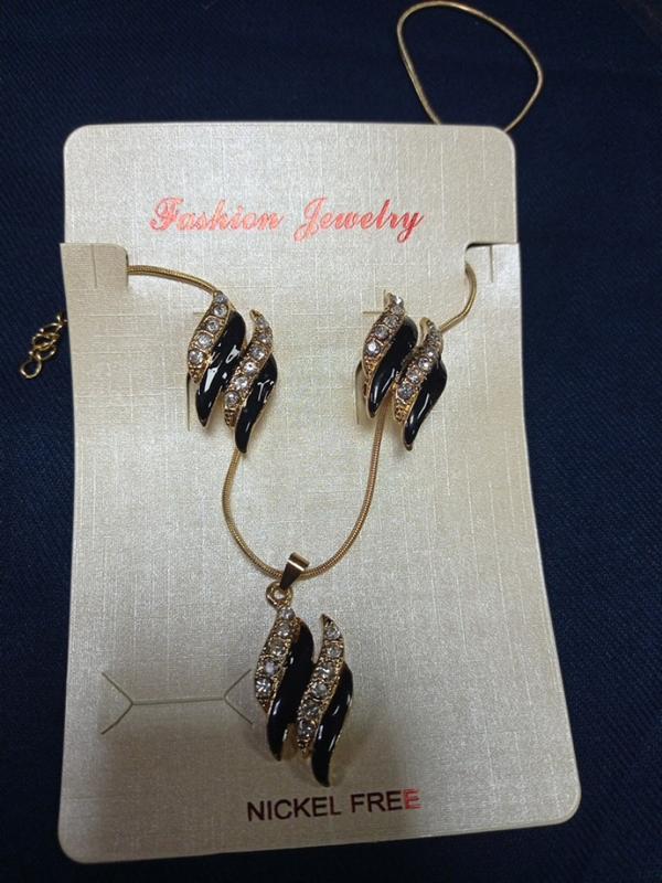 подвеска аккуратная..с черными вставками и камушками..желтая цепочка..регулируемый..серьги в комплекте.
