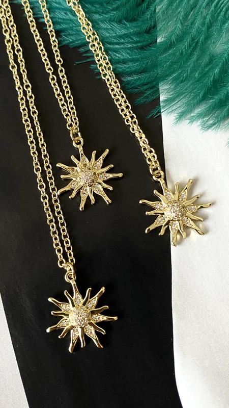 Підвіска сонце ☀️ з ланцюжком. Латунь з позолотою 14 карат. Розмір підвіски 18 мм. Всипана дрібними цирконами. Топова якість👍. Нарно блистить на світлі✨. Може бути чудовим подарунком 🎁.