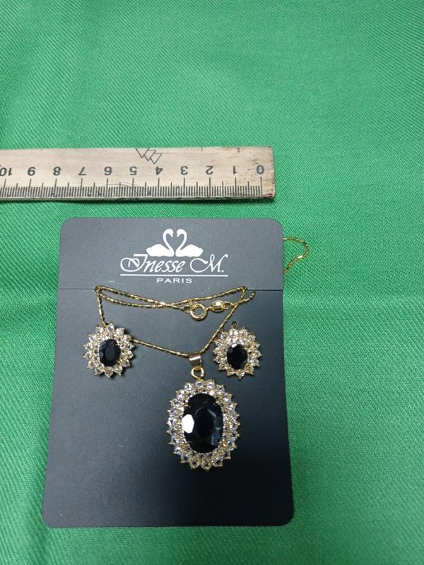 подвеска ажурная..желтый металл.. камушины.черные кристаллы..тонкая желтая цепочка..не тускнеет.высокое качество..серьги в комплекте.