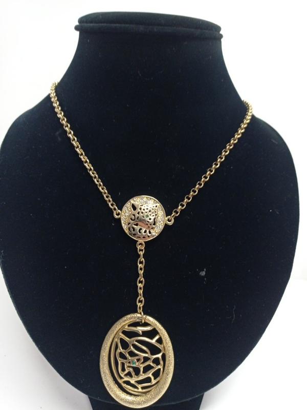 подвеска с продолжением..цепочка регулируется..желтый металл..камешки..глазки зеленые..красиво.