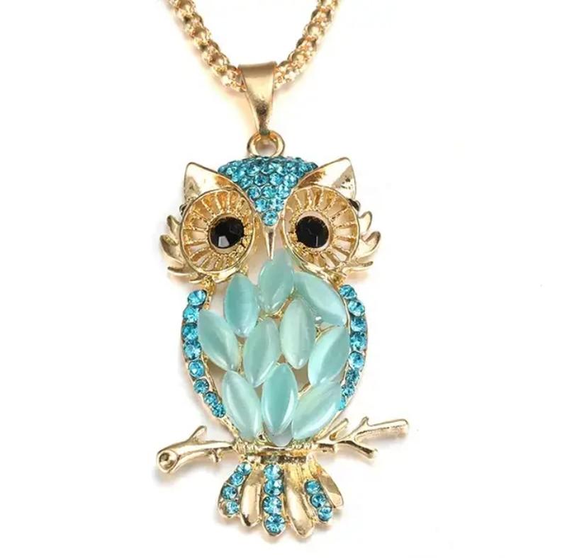 Подвеска в виде совы золотистого цвета с голубыми камушками и цепочкой