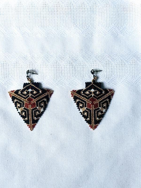 Оригинальные авторские серьги из бисера. Авторские серьги выполнены в стильных черно-золотисто-красных цветах. Серьги изготовлены исключительно из высококачественного ювелирного японского бисера. Яркие и эксклюзивные, с такими серьгами ваш образ точно не останется незамеченным и запомнится оригинальностью и изысканностью. Серьги выполнены в единственном экземпляре. Это отличный подарок к любому событию и незабываемый завершающий акцент любого образа. Длина сережек - 6.5. см. Дополнительные характеристики: Материал : Бисер