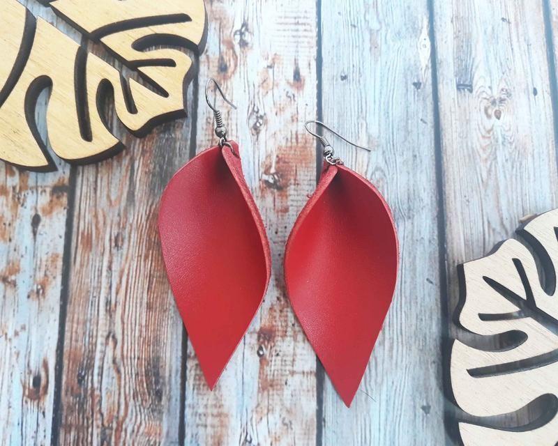 Чудові шкіряні сережки-листочки. Натуральна шкіра. Легка легка літня модель на кожен день. Вигини лінії крою підкреслюють шийку. Відмінний подарунок собі, дівчині, подрузі. Сережки вирушати в симпатичною крафтового упаковці. Додаткові характеристики: Колір: Червоний Матеріал: Шкіра