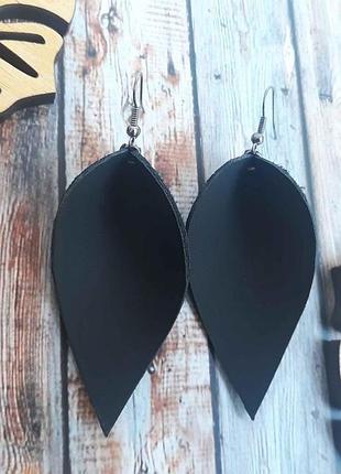 Чудові шкіряні сережки-листочки. Натуральна шкіра. Легка легка літня модель на кожен день. Вигини лінії крою підкреслюють шийку. Відмінний подарунок собі, дівчині, подрузі. Сережки вирушати в симпатичною крафтового упаковці. Додаткові характеристики: Колір: Чорний Матеріал: Шкіра