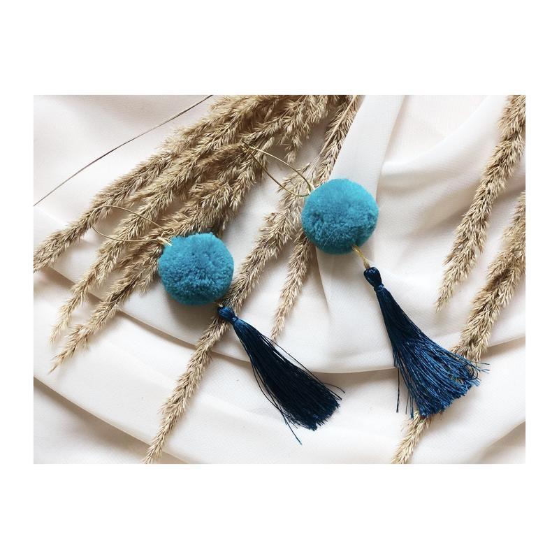 Серьги-помпоны красивого бирюзового цвета с кисточками. Прекрасные сережки для вечеринки или игривого настроения. Отличный подарок подружке, девушке или сестричке. Дополнительные характеристики: Цвет : Голубой Материал : Нитки