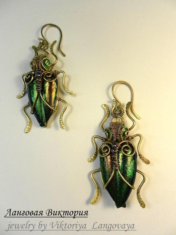 Серьги "жуки", малахит, опал, натуральные крылья жука.