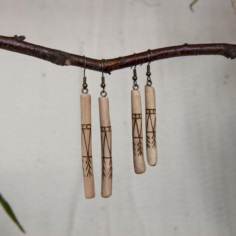 Довгі палички сережки з орнаметом, з деревини дуба, берези. еко сережки.