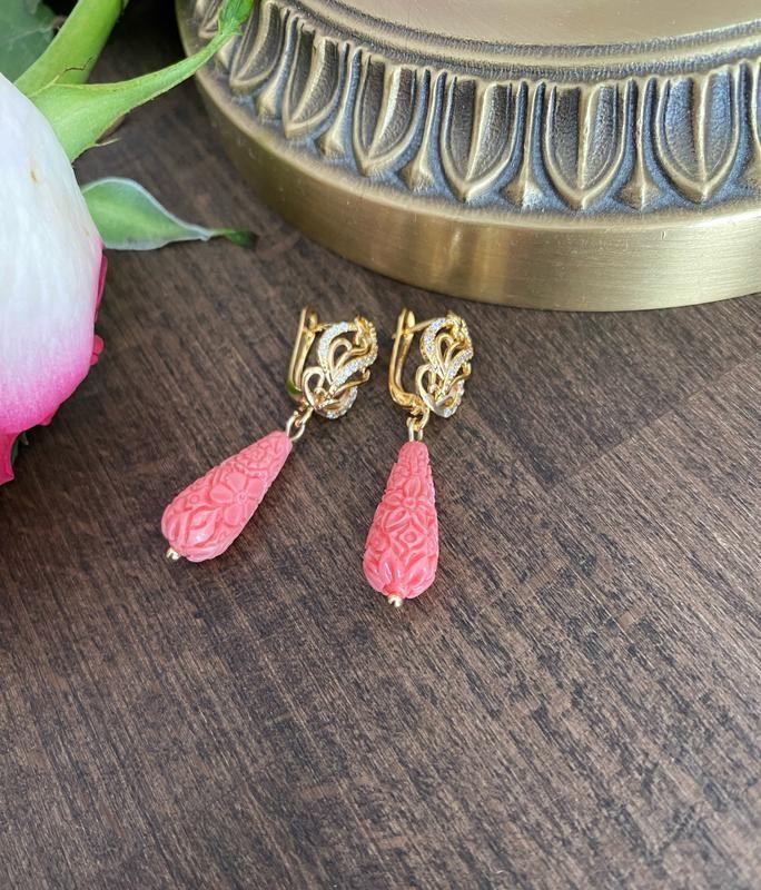 Сережки з різного коралу та позолоченої 24К фурнітури преміум класу. Довжина 4 см.