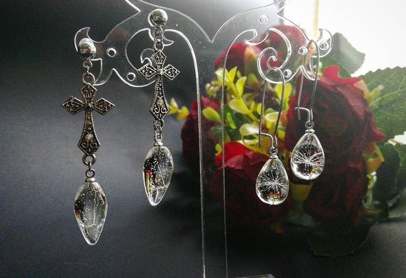 2 пары крошечных капель с пушинками одуванчика 🥰 размер от 1 до 1.5см Дополнительные характеристики: Материал : Металлическая фурнитура Материал : Эпоксидная смола