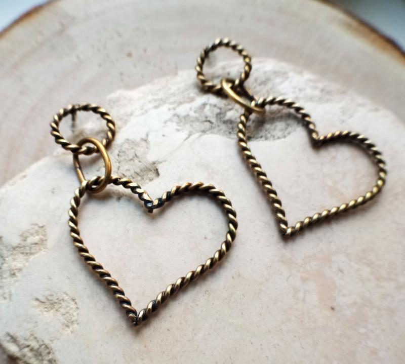 Серьги сердечки Ручная работа, выполнены из латуни Легкие и симпатичные Гвоздики из серебра Силиконовые заглушки размер 4 Х 2,5 см Вес одной серьги 1,5 гр Материалы: латунь, серебро Дополнительные характеристики: Цвет : Желтый Материал : Латунь