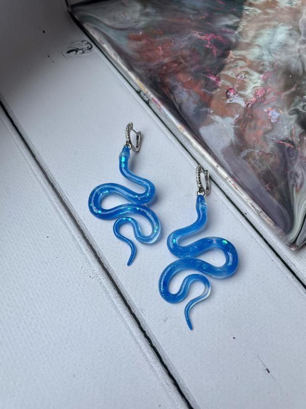 Серьги в виде змеи. На заказ, время изготовление 2-4 дня. Дизайн и цвет возможно изменить. Отличный подарок для девушки, сестры, подруги. -Длина подвески 5,8 см -Фурнитура: медицинский сплав -Материал епоксидная смола, легкие -В комплекте металлические заглушки -Будут упакованы в подарочную коробку или подарочный мешочек -Вместе с украшениями всегда идут стикера Дополнительные характеристики: Цвет : Голубой Цвет : Синий Камни / вставки : Цирконий Материал : Гипоаллергенная фурнитура Материал : Эпоксидная смола Товар под заказ