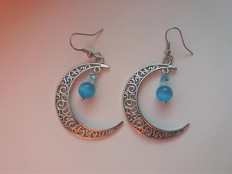 Серьги в виде луны с натуральным камнем (кошачий глаз) голубого цвета. Длина: 5,5 см.