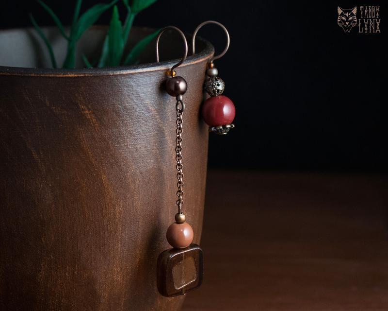 Пастельные серьги в тёплой цветовой гамме с натуральными камнями, асимметричные, стеклянными бусинками и медными элементами. Настоящая россыпь пряностей и сладостей для летнего или осеннего наряда! Отличный необычный подарок для девушки. Длинна серёжек: длинной - 7.5 см, короткой - 3.5 см. В комплекте также идут две пары застёжек - медные и силиконовые. Дополнительные характеристики: Цвет : Бежевый Цвет : Коричневый Цвет : Оранжевый