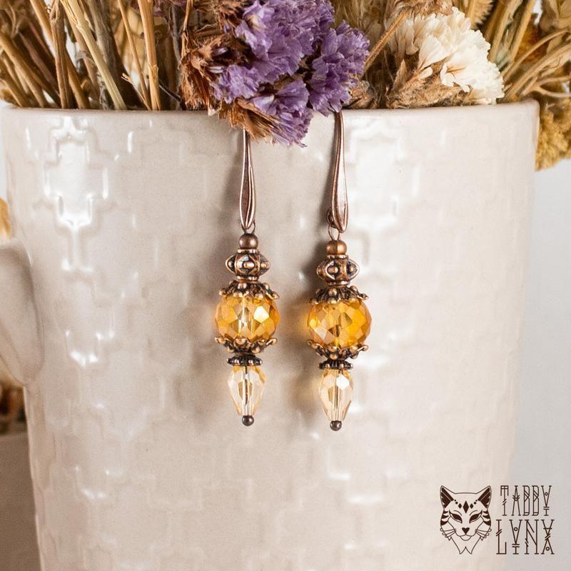 Аккуратные серьги с хрустальными гранёными бусинами солнечного жёлто-оранжевого оттенка, с ажурными медными элементами. Хорошо подойдёт к платью или блузке, а также к летним и осенним нарядам! Прекрасный подарок для неё на Новый год, День рождения и любой другой праздник. Также к этим серьгам можно приобрести колье с подвеской "Солнечный Бог" ****************************************************************************** Длина серёжек полностью - 5 см, ширина - 1.2 см. К ним в комплект идут силиконовые застёжки. Дополнительные характеристики: Цвет : Желтый Цвет : Оранжевый Материал : Бусины