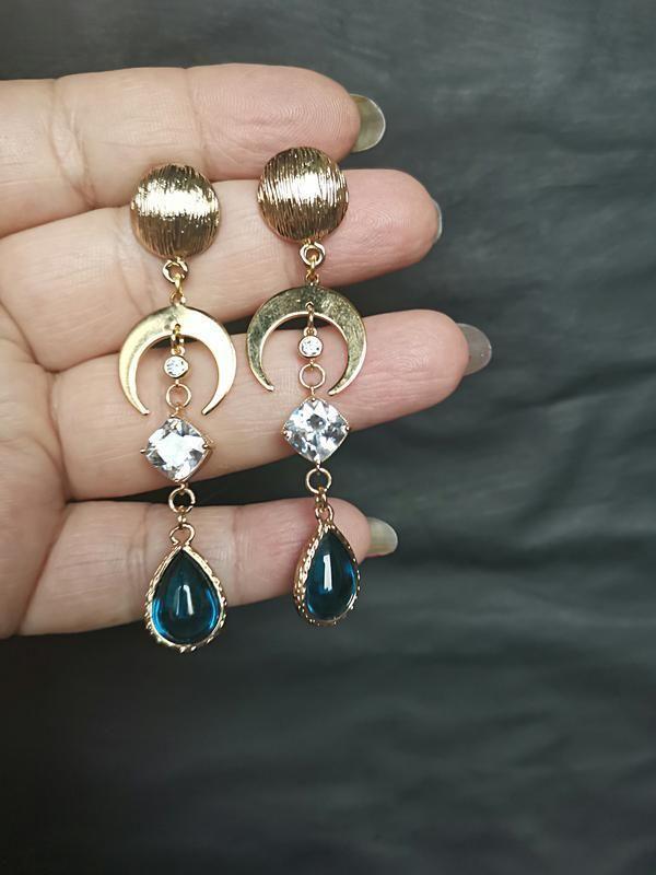 Довгі, стильні сережки з лунницями, ювелірним склом в оправі, позолоченою 24К фурнітури з цирконами. Гіпоалергенні. Додаткові характеристики: Колір: Жовтий Колір: Синій Камені / вставки: Цирконій Матеріал: Намистини Матеріал: Фурнітура гіпоалергенна Матеріал: Золото Матеріал: Латунь Матеріал: Скло