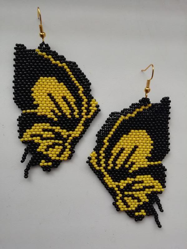 Бабочки "Невесомость". Ручной работы из чешского бисера. Мозаичное плетение. Размер: высота 7 см, ширина 5 см. Наличие в 2 цветах. Возможен повтор в желаемых цветах в течении 3 дней по предоплате . Дополнительные характеристики: Цвет : Желтый Цвет : Черный Материал : Бисер Материал : Металлическая фурнитура Материал : Нитки