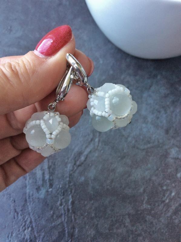 Білі сережки з бусін котяче око дуже ніжні, освіжаючі, підходять під все Додаткові характеристики: Колір: Білий Матеріал: Бісер Матеріал: Намистини