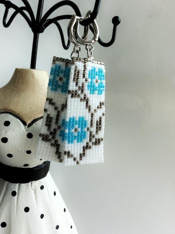 Білі легкі бісері сережки з блакитним орнаментом, фурнітура люкс качества, англійський замок Додаткові характеристики: Колір: Білий Колір: Блакитний Матеріал: Бісер
