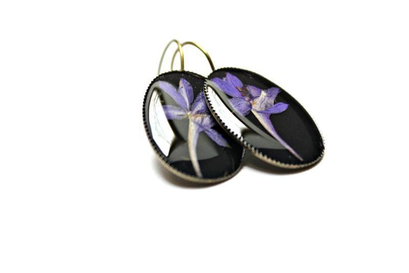 Серьги с дельфинумом. Цветы бережно собраны,высушены и залиты ювелирной смолой. Размер 13*18 мм Фурнитура корейская,цвет-бронза.Не содержит опасных добавок.