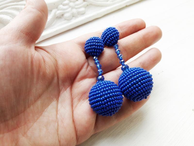 Бисерные серьги шарики со стеклянными бусинами, бисерные серьги-шарики