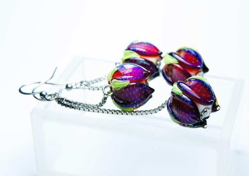 Серьги авторские "Сексуальность" Бутоны выполнены из очень красивого итальянского стекла. Необычайный оттенок красного винного с синим. Гармонично сочетаются с любым нарядом. Подойдут просто под красную помаду или красивый аксессуар в тон)) Размер бутона 1,4 на 1 см. Также использовала медицинскую сталь. Длина всего изделия 5 см (или любая на заказ). Застёжки швензы. Возможен подбор любой застёжки. В комплект к изделию красивая упаковка. Дополнительные характеристики: Цвет : Красный Цвет : Синий Материал : Бусины Материал : Гипоаллергенная фурнитура Материал : Медицинская сталь Материал : Стекло Товар под заказ