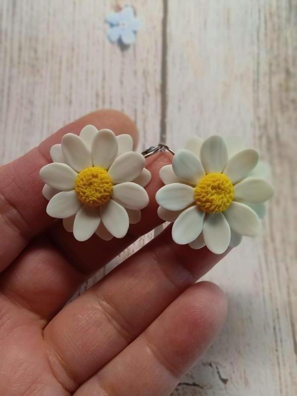 Серьги ромашки из полимерной глины Дополнительные характеристики: Цвет : Белый Материал : Медицинская сталь Материал : Полимерная глина Товар под заказ