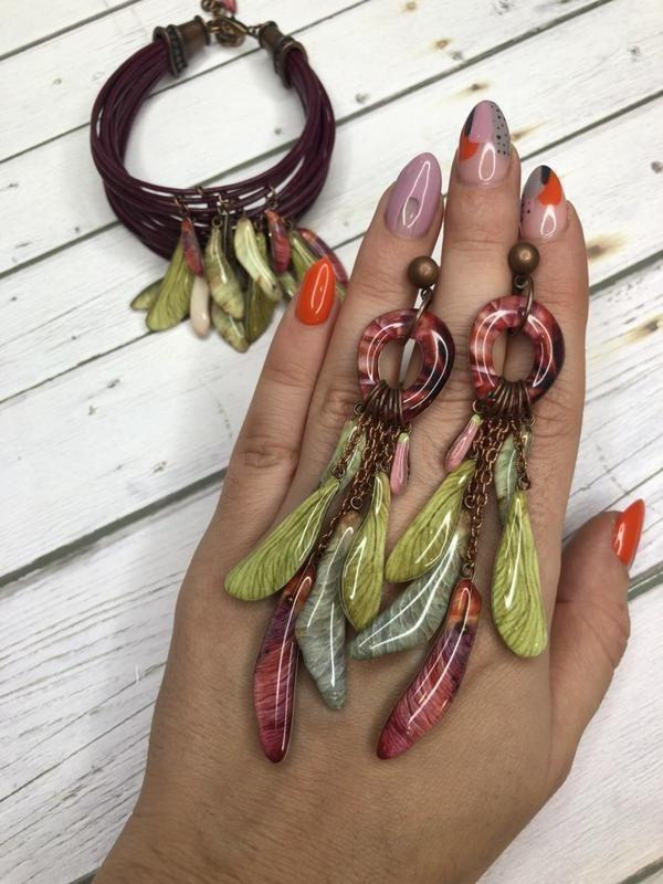 Серьги с фирменными подвесками из ювелирной смолы в виде листиков дерева клена. Крепление -гвоздик) Серьги можно дополнить кожаным браслетом в комплект (цена браслета -490 грн) Дополнительные характеристики: Материал : Эпоксидная смола