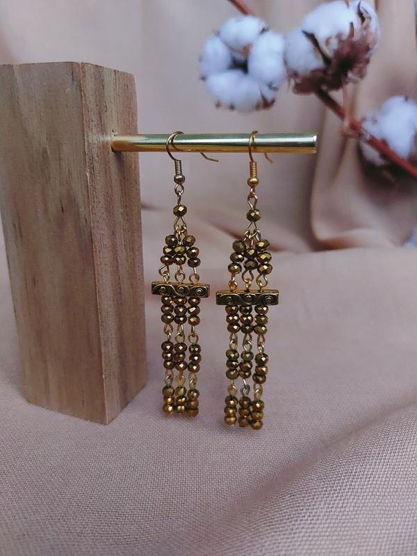 Довгі сережки з кришталю в грецькому стилі колір темне золото