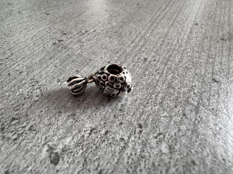 Шарм от бренда Pandora. Рыбка двигается хвостик, глаза голубой камень. Серебро, присоединительная гравировка.