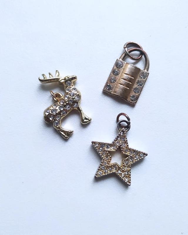 Лот подвесок шармов. Все вставки стеклянные. Олень в отличном состоянии. Звезда и замочек имеют потертости учтенного покрытия.