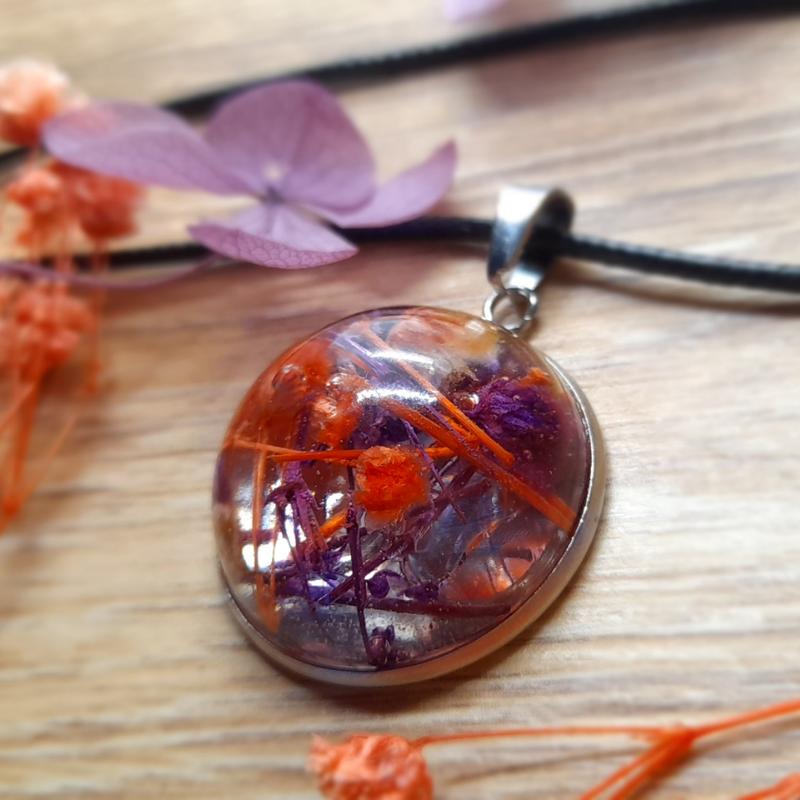 Сушеницы в кулоне, яркий кулон женский, ручная работа, полусфера, ботанический кулон, фиол...